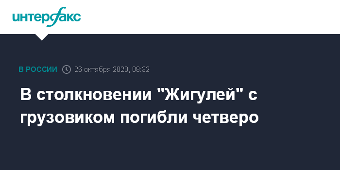 Москва. 26 октября. INTERFAX.RU - В Емельяновском районе Красноярского края столкнулись грузовик DAF и ВАЗ-2107. Погиб 17-летний водитель "Жигулей" и трое его пассажиров - две молодых женщины и четырехлетний мальчик, сообщили в региональном управлении МВД.