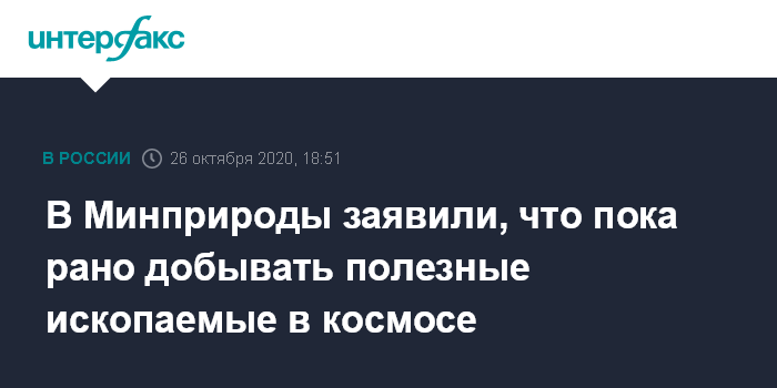 Москва. 26 октября. INTERFAX.RU - Минприроды не планирует развивать добычу полезных ископаемых в космосе, сообщил журналистам глава министерства Дмитрий Кобылкин.