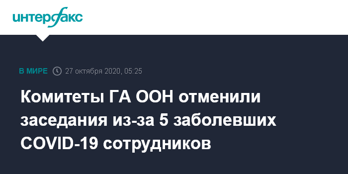 "После того, как была получена информация из Секретариата ООН о пяти случаях заражения COVID-19 в диппредставительстве государства-члена, медицинское подразделение Секретариата рекомендует отменить личные встречи в штаб-квартире во вторник, 27 октября", - говорится в письме председателя, копия которого имеется в распоряжении "Интерфакса".