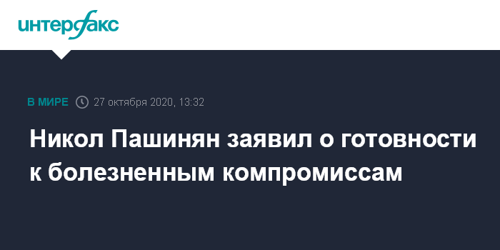 Москва. 27 октября. INTERFAX.RU - Премьер-министр Армении Никол Пашинян заявил о готовности армянского народа к болезненным компромиссам по карабахскому урегулированию.
