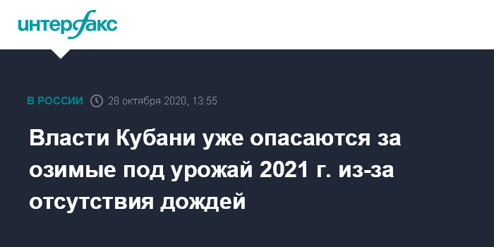 Москва. 28 октября. INTERFAX.RU - Власти Краснодарского края, одного из ведущих производителей зерна в РФ, выражают опасения за будущий урожай озимых культур из-за отсутствия дождей этой осенью и прогнозов теплой зимы.