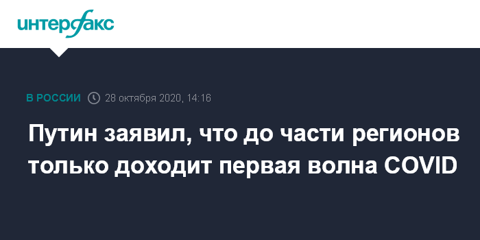 Москва. 28 октября. INTERFAX.RU - По мнению специалистов, до некоторых регионов России еще только докатывается первая волна коронавируса, сообщил президент РФ Владимир Путин.