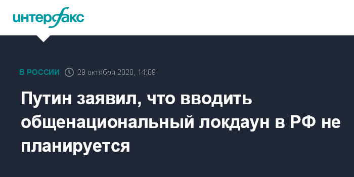 Москва. 29 октября. INTERFAX.RU - Общенациональный локдаун в России в связи с ситуацией вокруг коронавируса вводить не планируется, заявил президент РФ Владимир Путин.