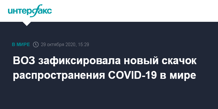 Москва. 29 октября. INTERFAX.RU - Количество выявленных за сутки новых случаев заражений коронавирусом по всему миру за последние сутки вновь резко возросло и составило 404 159, сообщает в четверг Всемирная организация здравоохранения.