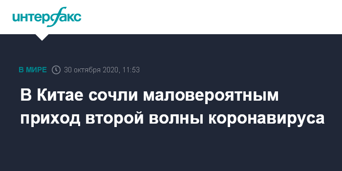 Москва. 30 октября. INTERFAX.RU - В Китае вряд ли начнется вторая волна заражений коронавирусом COVID-19, считает ведущий эпидемиолог страны Чжун Наньшань