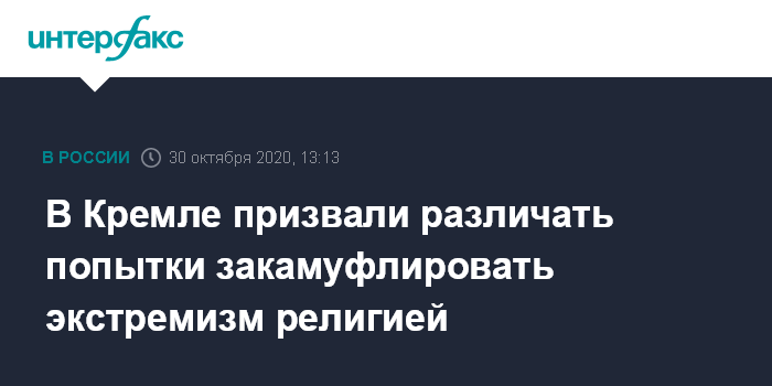 Москва. 30 октября. INTERFAX.RU - Экстремизм не имеет никакого отношения к религии, необходимо четко понимать, когда это пытаются закамуфлировать, заявил пресс-секретарь президента РФ Дмитрий Песков.