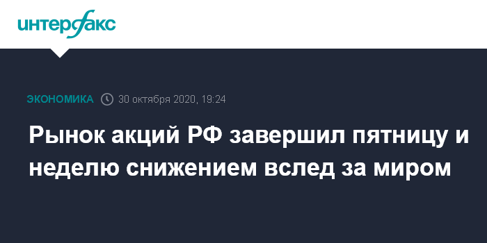 Москва. 30 октября. INTERFAX.RU - Рынок акций РФ в пятницу продолжил снижение вслед за внешними фондовыми биржами и нефтью на фоне роста числа заражений COVID-19 в мире и выхода инвесторов из рисковых активов в преддверии президентских выборов в США; индекс МосБиржи не удержал рубеж 2700 пунктов.