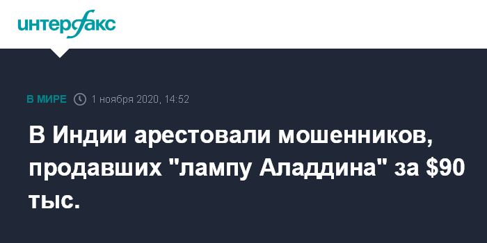 Москва. 1 ноября. INTERFAX.RU - Двое мужчин, которых подозревают в продаже "лампы Алладина" и даже вызове фальшивого джинна, арестованы в Индии.