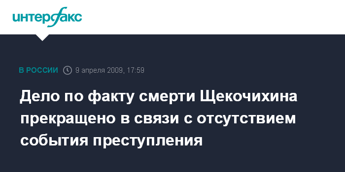 Москва. 9 апреля. INTERFAX.RU - Уголовное дело по факту смерти журналиста Юрия Щекочихина прекращено в связи с отсутствием события преступления, заявили "Интерфаксу" в Следственном комитете при прокуратуре (СКП) РФ.