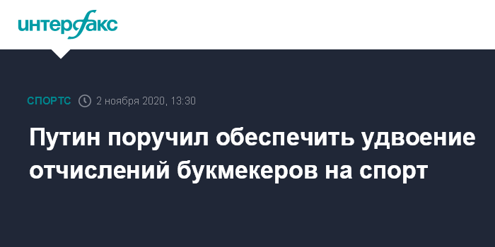 Соответствующее поручение главы государства опубликовано на сайте Кремля в понедельник. Согласно документу, правительство до 1 марта 2021 года должно разработать и внести в Госдуму "проект федерального закона, предусматривающего увеличение не менее чем в два раза размера целевых отчислений от азартных игр, уплачиваемых организаторами азартных игр в букмекерских конторах, совершенствование порядка уплаты таких отчислений, порядка их направления на финансирование мероприятий по развитию спорта и порядка целевого использования таких отчислений, а также предусматривающего осуществление государственного контроля за уплатой таких отчислений и их целевым использованием".