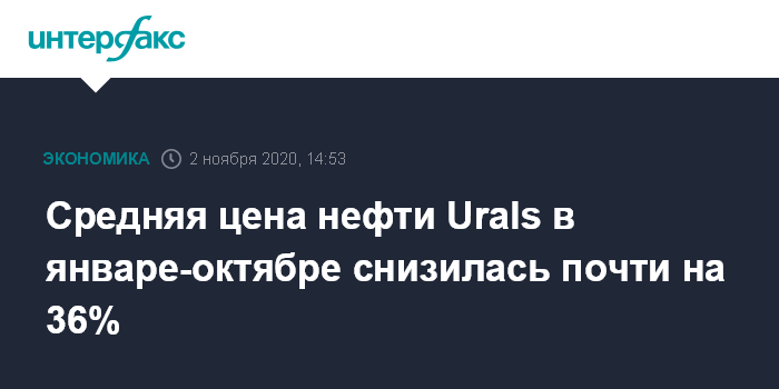 Средняя цена на нефть марки Urals в октябре составила $40,53 за баррель, в октябре 2019 года она составляла $58,45 за баррель.