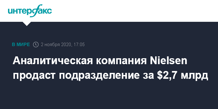 Москва. 2 ноября. INTERFAX.RU - Глобальная аналитическая компания Nielsen Holdings сообщила, что продает подразделение Nielsen Global Connect, занимающееся исследованием потребительского поведения для сферы розничной торговли, за $2,7 млрд фонду прямых инвестиций Advent International и экс-главе TransUnion Джеймсу Пеку.