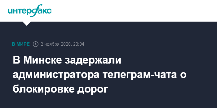 Москва. 2 ноября. INTERFAX.RU - Задержан администратор телеграм-чата "Минск. Перекрытие дорог", сообщила в понедельник официальный представитель МВД Белоруссии Ольга Чемоданова.