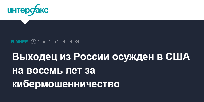 Москва. 2 ноября. INTERFAX.RU - Суд в США приговорил к восьми годам тюрьмы выходца из России Александра Бровко за участие в кибермошенничестве с ущербом примерно $100 млн, сообщил американский Минюст.