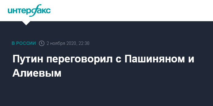 "1 ноября и 2 ноября соответственно состоялись телефонные разговоры президента Российской Федерации Владимира Путина с премьер-министром Республики Армения Николом Пашиняном и президентом Азербайджанской Республики Ильхамом Алиевым. Обстоятельно обсуждены вопросы урегулирования нагорно-карабахского конфликта", – говорится в сообщении.