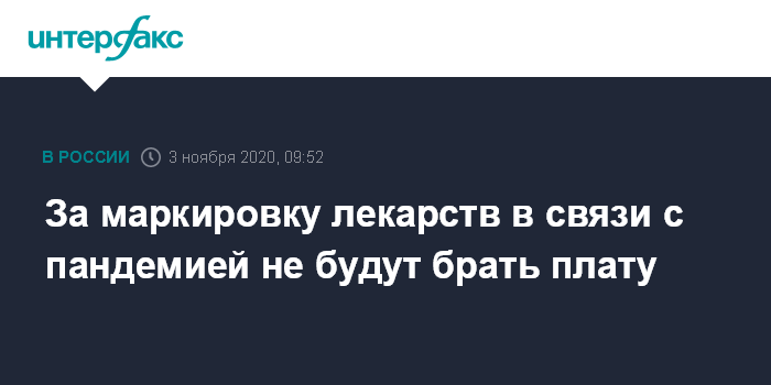Москва. 3 ноября. INTERFAX.RU - Оператор системы маркировки Центр развития перспективных технологий (ЦРПТ) будет выдавать и прослеживать коды на все лекарственные препараты, произведенные с ноября 2020 года до февраля 2021 года, на безвозмездной основе.