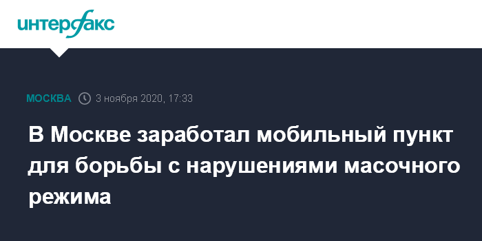 Москва. 3 ноября. INTERFAX.RU - В Москве начал работу мобильный пункт, который оборудован техникой для составления протоколов о нарушении масочного режима на месте, сказал главный инспектор объединения административно-технических инспекций (ОАТИ) столицы Антон Камнев журналистам во вторник.