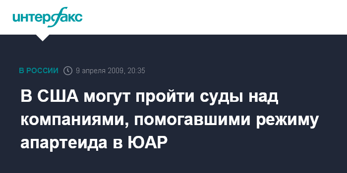 Лондон. 9 апреля. INTERFAX.RU - Судья в США разрешила проведение судебных процессов против нескольких компаний, которые обвиняются в оказании помощи режиму расовой сегрегации - апартеида, правившего в ЮАР до середины 90-х годов прошлого столетия.
