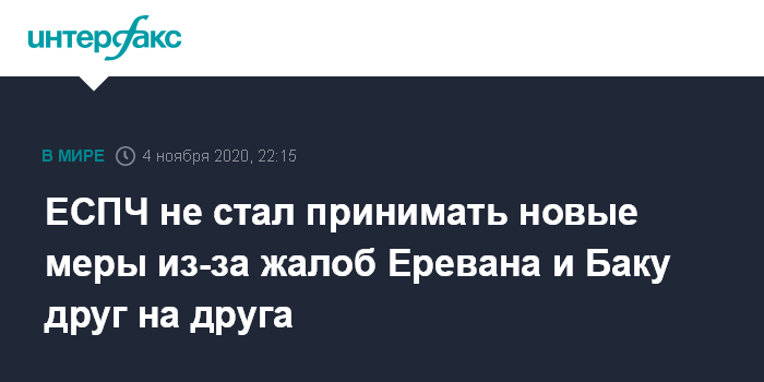 Москва. 4 ноября. INTERFAX.RU - Европейский суд по правам человека (ЕСПЧ) не будет принимать новых мер из-за жалоб Армении и Азербайджана друг на друга, потому что в целом они не относятся к его юрисдикции.