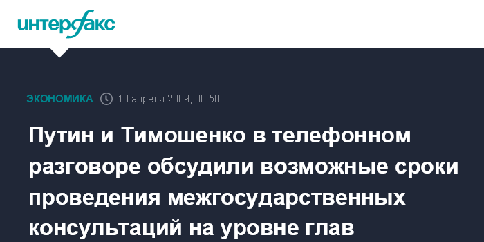 Москва. 10 апреля. ИНТЕРФАКС - Премьер-министры РФ и Украины Владимир Путин и Юлия Тимошенко в ходе телефонного разговора обсудили возможные новые сроки проведения межгосударственных консультаций на уровне глав правительств двух стран, заявил пресс-секретарь премьер-министра РФ Дмитрий Песков.
