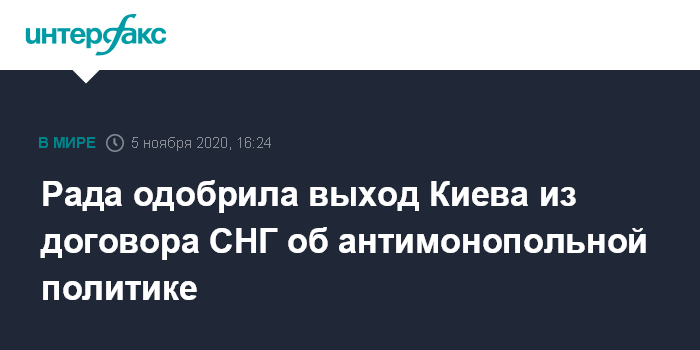 Москва. 5 ноября. INTERFAX.RU - Верховная рада Украины поддержала законопроект о выходе из Договора о проведении согласованной антимонопольной политики со странами Содружества независимых государств.