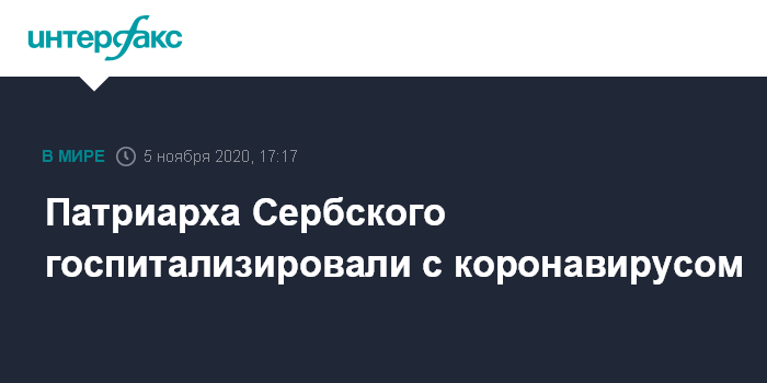Москва. 5 ноября. INTERFAX.RU - Патриарха Сербского Иринея госпитализировали после положительного теста на коронавирус COVID-19, говорится в заявлении, размещенном на сайте Сербской православной церкви.
