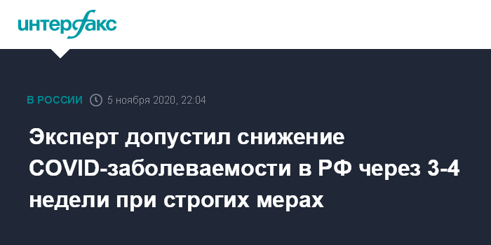 Москва. 5 ноября. INTERFAX.RU - Рост заболеваемости коронавирусом в РФ может прекратиться через три-четыре недели, но для этого необходимо ввести более строгие ограничения, считает замдиректора института эпидемиологии и микробиологии имени Пастера Александр Семенов.