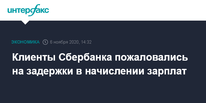 Москва. 6 ноября. INTERFAX.RU - Клиенты Сбербанка стали жаловаться, что перечисление зарплат на их счета, привязанные к картам банка, запоздало почти на сутки. Операции, которые ожидались днем в четверг, прошли после 11:30 по Москве в пятницу, говорят они.