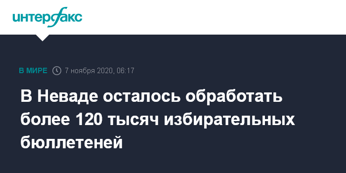 Москва. 7 ноября. INTERFAX.RU - В американском штате Невада с шестью голосами членов коллегии выборщиков осталось подсчитать около 124,5 тысячи бюллетеней, сообщает канцелярия госсекретаря штата.
