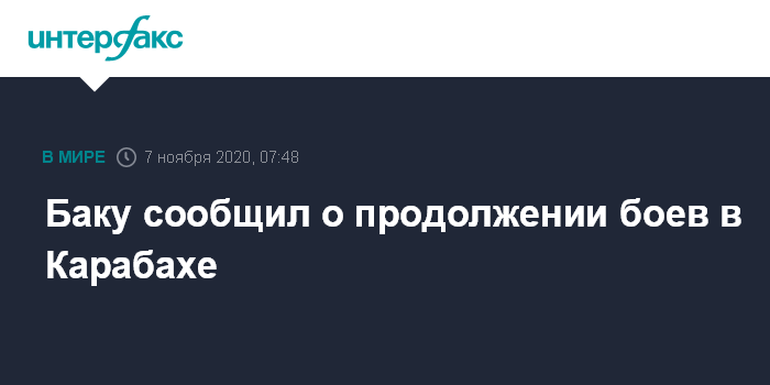 Москва. 7 ноября. INTERFAX.RU - Министерство обороны Азербайджана сообщает о продолжении боевых действий в Нагорном Карабахе на всех направлениях фронта.
