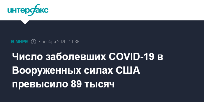 Москва. 7 ноября. INTERFAX.RU - Количество заболевших коронавирусом в Вооруженных силах США составило 89,1 тыс., увеличившись за две недели более чем на 11%, следует из данных Пентагона.