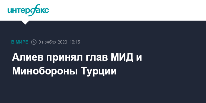Москва. 8 ноября. INTERFAX.RU - Президент Азербайджана Ильхам Алиев принял главу МИД Турции Мевлюта Чавушоглу и министра национальной обороны Хулуси Акара, сообщает пресс-служба главы государства.