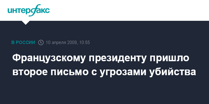 Москва. 10 апреля. INTERFAX.RU - В администрации президента Франции Николя Саркози получено еще одно письмо с угрозами убийства в адрес главы государства и двумя пулями.