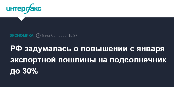 Москва. 9 ноября. INTERFAX.RU - РФ с 1 января 2021 года может повысить экспортную пошлину на подсолнечник до 30% с нынешних 6,5%, сообщил "Интерфаксу" источник на рынке.