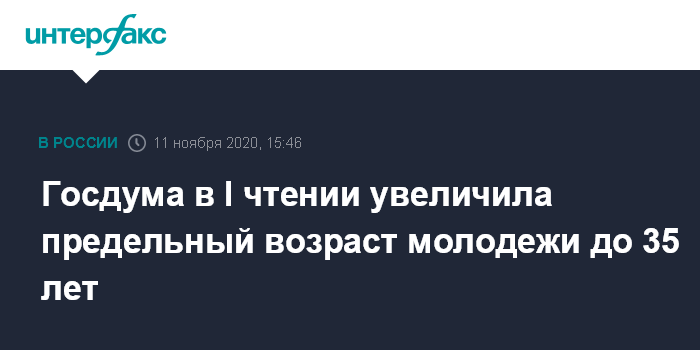 Москва. 11 ноября. INTERFAX.RU - Госдума на заседании в среду приняла в первом чтении законопроект об увеличении возраста граждан, относящихся к молодежи, с 30 до 35 лет.
