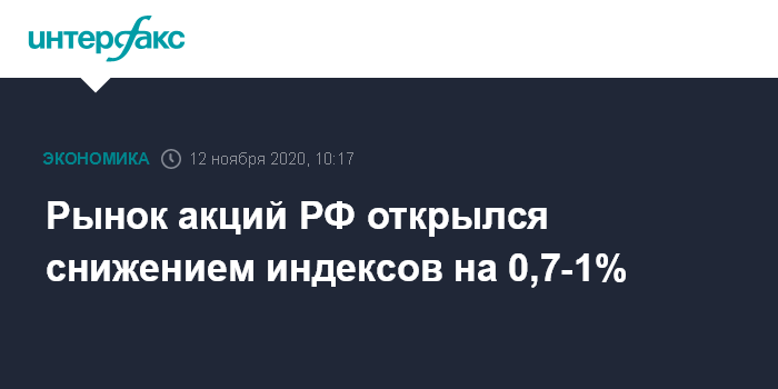 Москва. 12 ноября. INTERFAX.RU - Рынок акций РФ открылся в четверг снижением цен blue chips на фоне наметившейся коррекции внешних рынков после ралли с начала недели, подогретого новостями об успешном испытании компаниями Pfizer и BioNTech вакцины от COVID-19; индексы МосБиржи и РТС за минуту торгов потеряли 0,7-1%, причем первый не удержал рубеж 3000 пунктов.