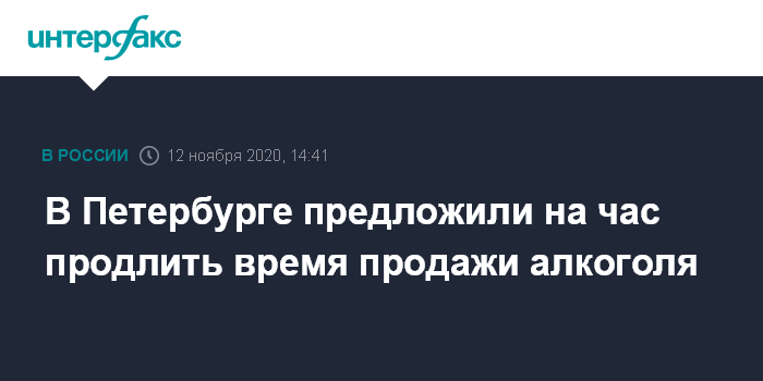 Москва. 12 ноября. INTERFAX.RU - Петербургский парламент обсудит инициативу о продлении времени продажи алкоголя на час - до 23:00, сообщил "Интерфаксу" в четверг председатель комитета по законодательству Денис Четырбок.