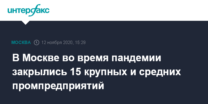 Москва. 12 ноября. INTERFAX.RU - Среди крупных и средних промышленных предприятий в Москве во время пандемии закрылись 15, сообщил в четверг глава столичного департамента инвестиционной и промышленной политики Александр Прохоров.