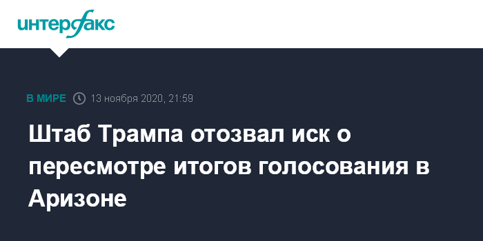 Москва. 13 ноября. INTERFAX.RU - Юристы предвыборного штаба президента США Дональда Трампа в пятницу отозвали иск с требованием пересмотра результатов голосования на президентских выборах в штате Аризоне.