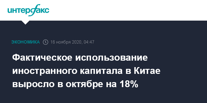 Москва. 16 ноября. INTERFAX.RU - Фактическое использование иностранного капитала в октябре текущего года выросло в Китае на 18,4% по сравнению с тем же периодом 2019 года, составив $11,83 млрд, сообщило министерство коммерции КНР в понедельник.