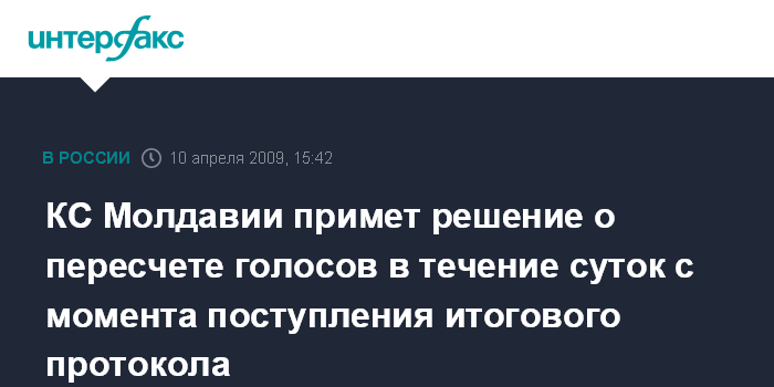 Кишинев. 10 апреля. INTERFAX.RU - Конституционный суд Молдавии (КСМ) примет решение относительно возможного пересчета голосов на выборах в течение 24 часов с момента поступления итогового протокола, заявил "Интерфаксу" председатель КСМ Дмитрий Пулбере.