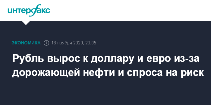 По мнению экспертов "Интерфакс-ЦЭА", укрепление рубля к доллару и евро 16 ноября является следствием благоприятной ситуации на мировых рынках капитала, в том числе на нефтяных площадках. Глобальные инвесторы продолжают покупать рисковые активы после состоявшихся в США президентских выборов, а также на новостях о разработке вакцин от COVID-19.