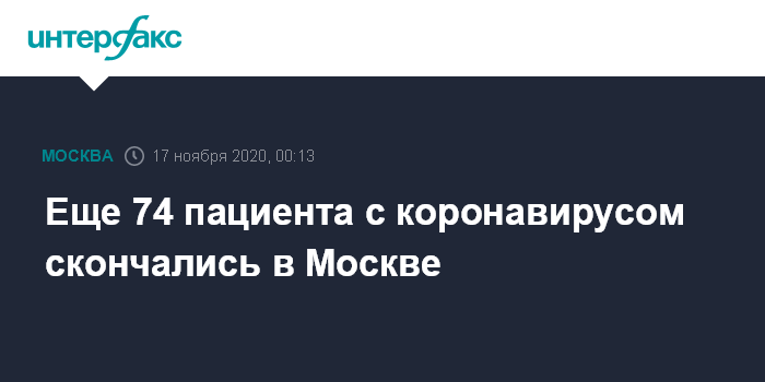 "В Москве скончались 74 пациента, у всех был подтвержден диагноз пневмония и получен положительный результат тестов на коронавирусную инфекцию", - сообщили "Интерфаксу" в оперштабе по контролю и мониторингу ситуации с коронавирусом в Москве.