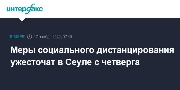 Москва. 17 ноября. INTERFAX.RU - Более строгие правила социального дистанцирования вводятся в столице Южной Кореи с четверга на фоне роста числа случаев заражения COVID-19, сообщают местные СМИ.