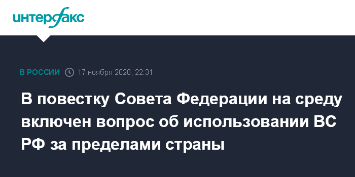 Москва. 17 ноября. INTERFAX.RU - Совет Федерации в среду рассмотрит вопрос об использовании Вооруженных Сил РФ за пределами России, говорится в повестке заседания на сайте верхней палаты.