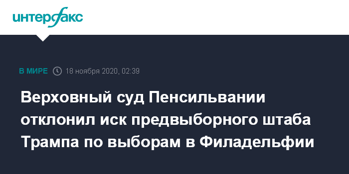 Москва. 18 ноября. INTERFAX.RU - Верховный суд Пенсильвании отклонил иск предвыборного штаба президента США Дональда Трампа, в котором утверждалось, что его представители были незаконно лишены возможности наблюдать должным образом за подсчетом голосов в Филадельфии.