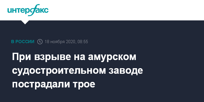 Москва. 18 ноября. INTERFAX.RU - В среду в Амурской области произошел взрыв на судостроительном заводе имени Октябрьской революции, пострадали три человека, рассказал представитель завода Валерий Силкин.