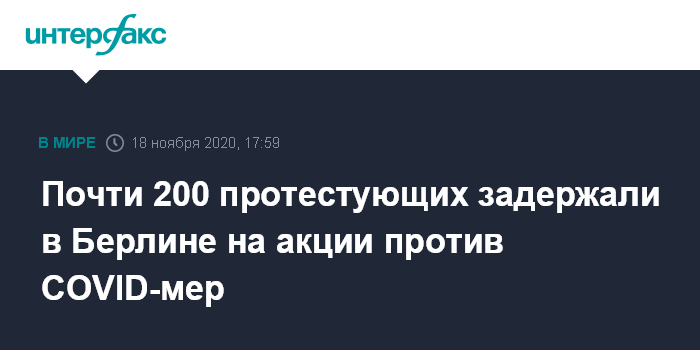 Москва. 18 ноября. INTERFAX.RU - Почти 200 человек задержали в Берлине в среду на акции протеста против мер защиты от коронавируса, сообщил сенатор города по внутренним делам Андреас Гайзель.