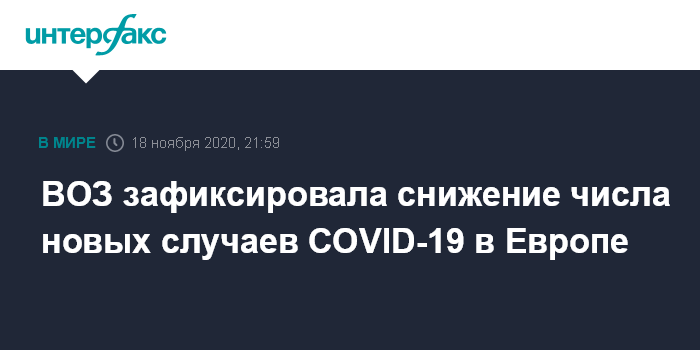 Москва. 18 ноября. INTERFAX.RU - В Европе фиксируется снижение темпов распространения коронавируса COVID-19, однако количество летальных исходов растет, сообщили в среду во Всемирной организации здравоохранения (ВОЗ).