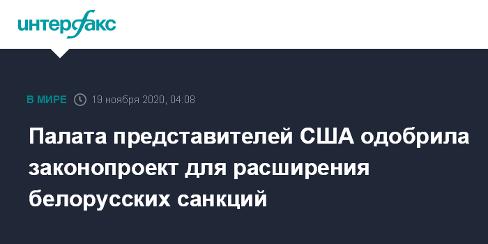 Москва. 19 ноября. INTERFAX.RU - Члены Палаты представителей США одобрили на голосовании законопроект, который в случае окончательного утверждения даст Вашингтону возможность вводить дополнительные санкции против Белоруссии.